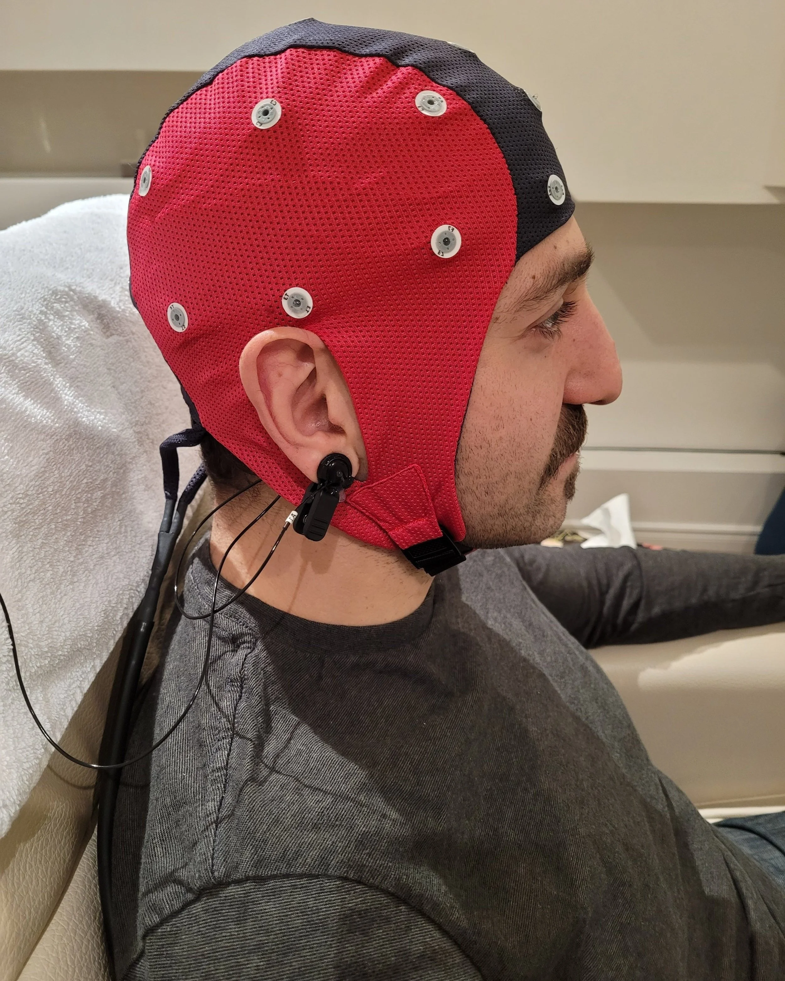 The Neurofeedback trainee sits in a comfortable reclining chair with sensors attached to the scalp and ears.